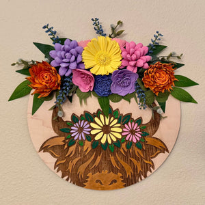 A wood wreath featuring an adorable Highland cow wearing a floral . Made with sola flower artists in mind with a large space to add wood flowers and greenery to make your wreath complete